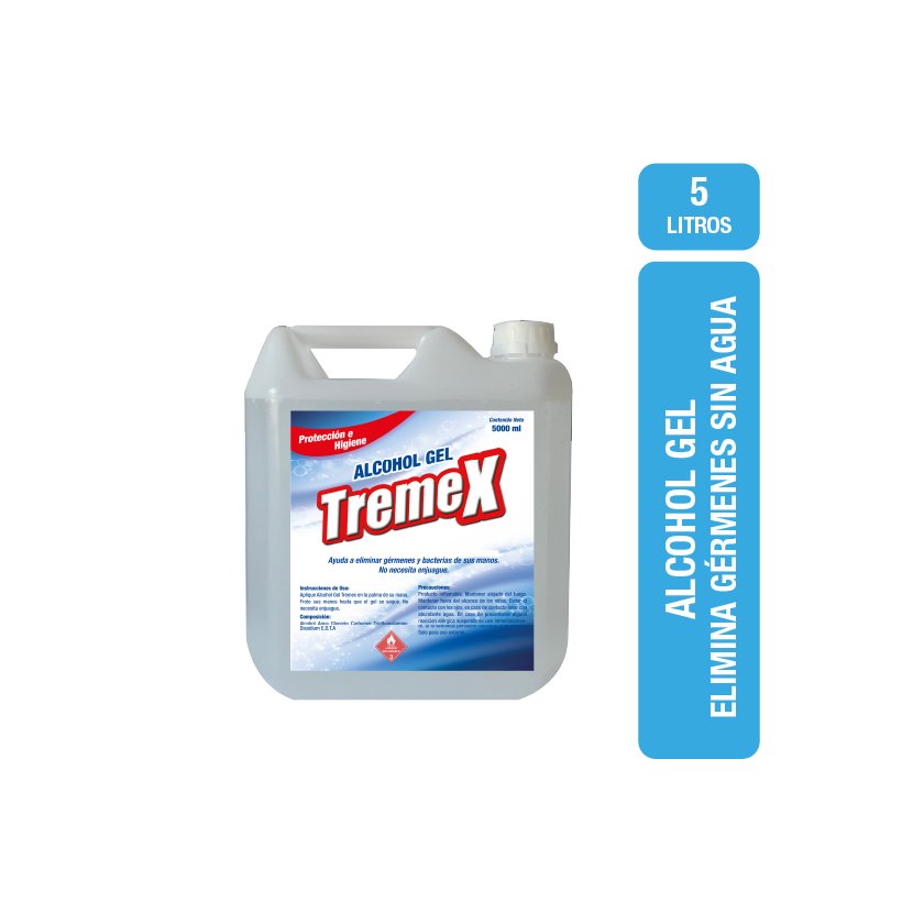 Alcohol gel TREMEX para higiene frecuente de manos. Su formato de 5 L es adecuado para hogares, oficinas, comercios y espacios de atención, permitiendo apoyar rutinas de higiene personal de manera rápida y conveniente.