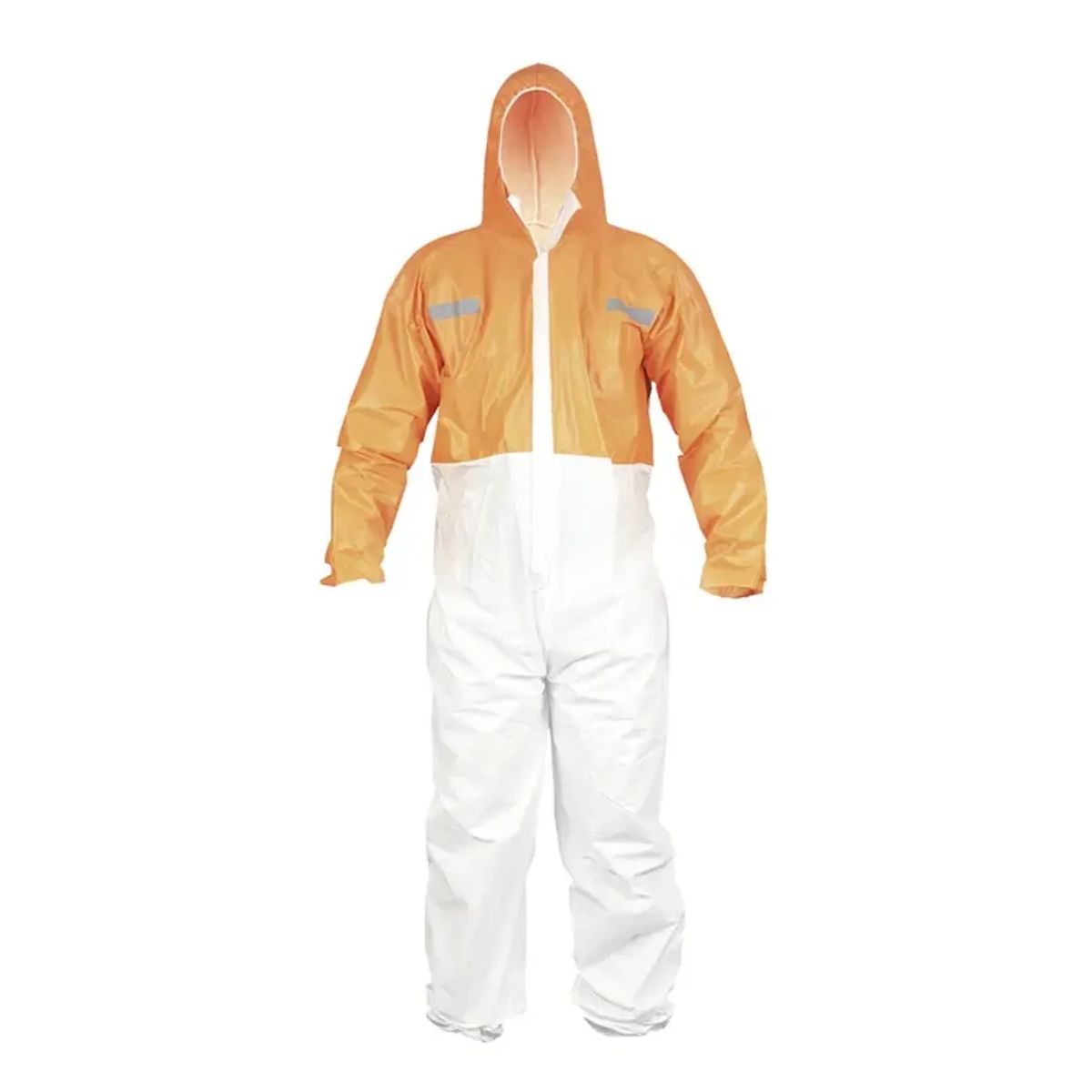 Buzo coverall 100% polipropileno. Tela respirable y tela laminada microporosa. Uniones con doble costura. Cierre frontal con tapeta para mayor protección y durabilidad. Recomendado para trabajos que involucran polvo en suspensión. Color naranjo/blanco de alta visibilidad. Cinta reflectante en pecho y espalda.