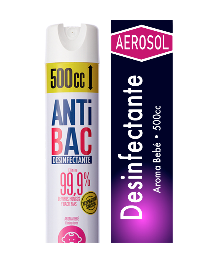 Desinfectante ANTIBAC en aerosol versión bebé, 500 ml. Sanitiza ambientes en hogares, oficinas y áreas compartidas con fórmula suave.