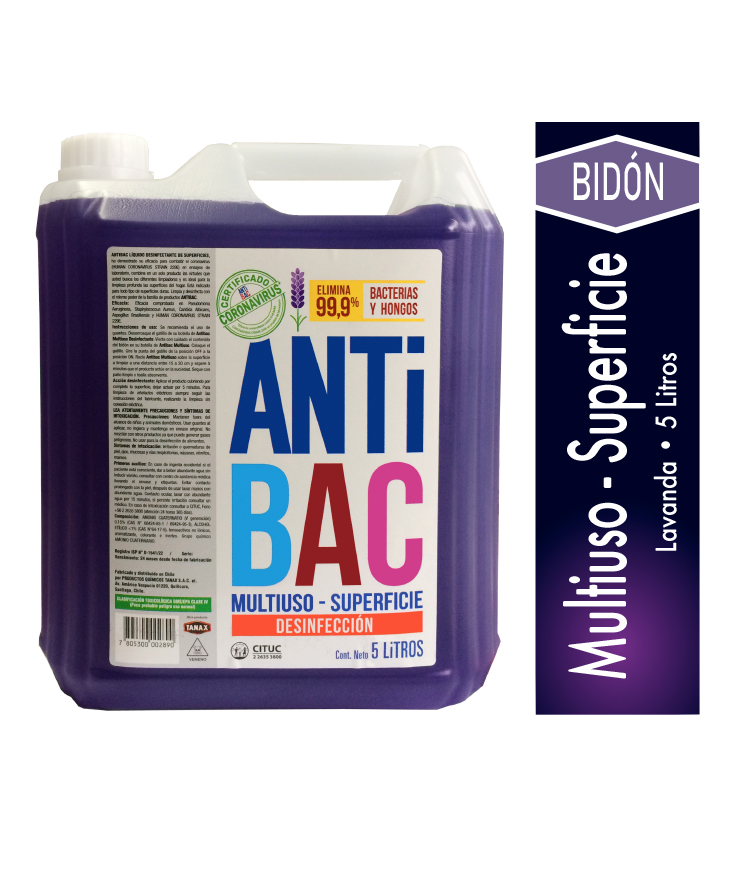Desinfectante multiuso de la marca ANTIBAC. Su presentación de 5 L lo hace adecuado para tareas de limpieza, higiene y mantención en hogares, oficinas, comercios o entornos institucionales. Diseñado para apoyar rutinas de limpieza e higiene en distintas áreas.