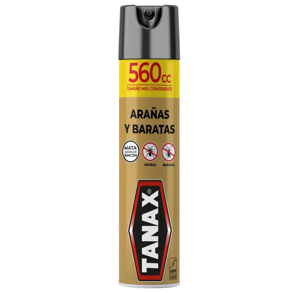 Insecticida TANAX en aerosol contra arañas y baratas. Presentación de 560 ml para control de plagas en hogares, oficinas y áreas exteriores.