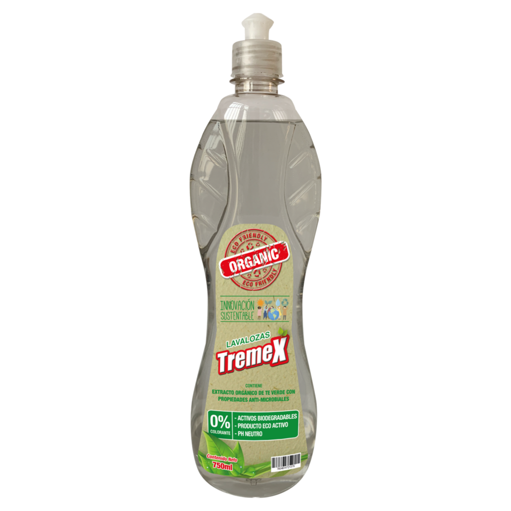 Lavaloza líquido TREMEX Organic Ecoactivo, 750 ml. Limpieza diaria de loza con fórmula biodegradable.