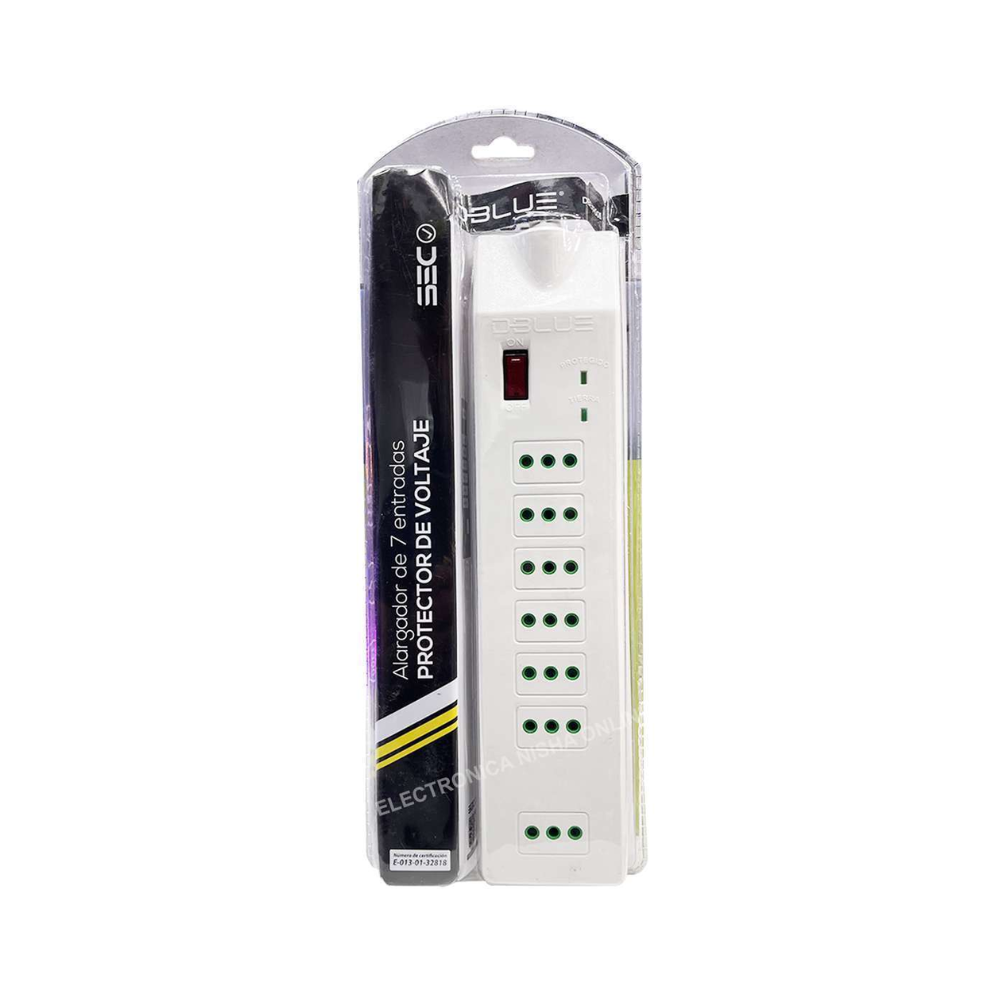 Alargador de 7 entradas. Botón de On / Off. Indicador de protección de niños on / off. Indicador led de conexión a tierra. Salida distanciada para enchufes grandes. Tensión eléctrica: 250V / 10AMP / 2500w. Capacidad de disipación: 1400 Joules. Longuitud de cable: 2.1 mt. Norma de seguridad: IEC.