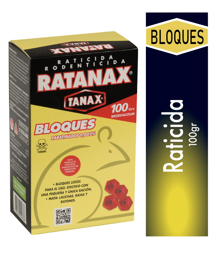 Raticida RATANAX en formato bloques, pensado para apoyar labores de control de roedores en distintos entornos. Su presentación de 100 g facilita su disposición en áreas definidas según necesidad operativa.