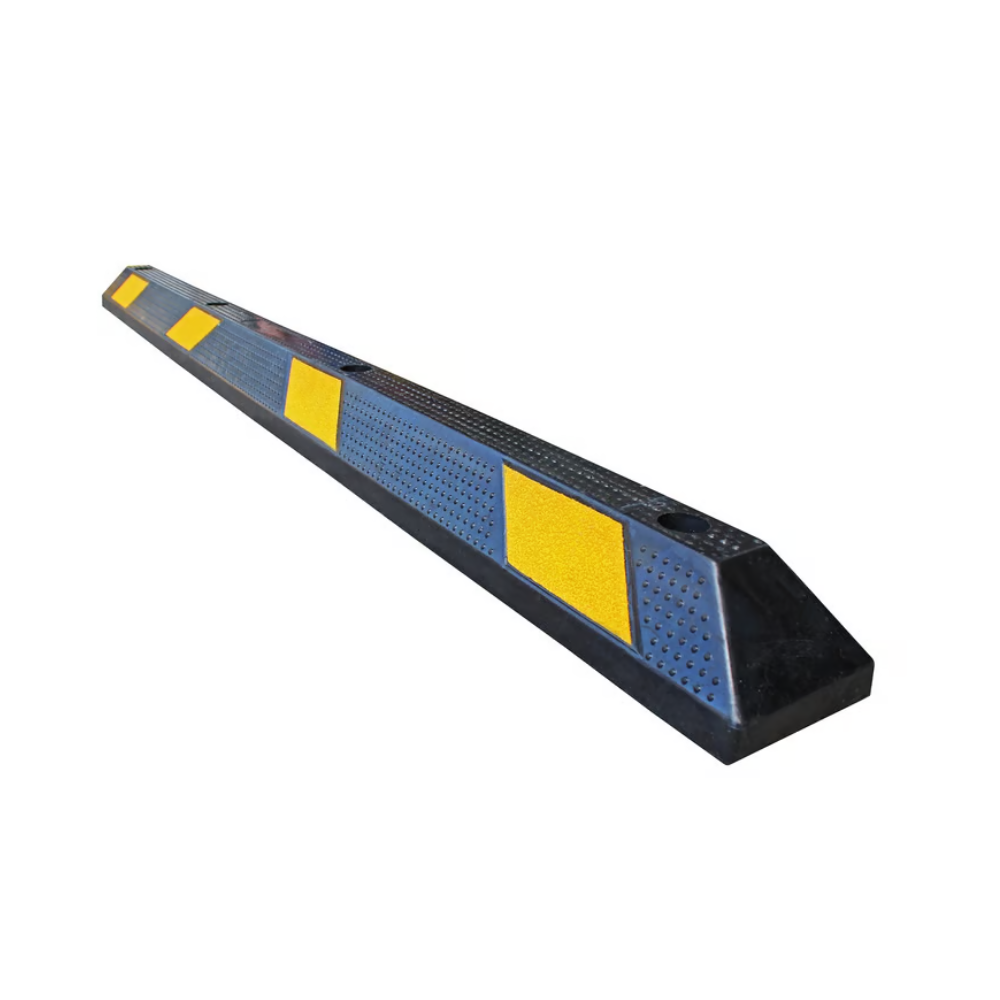 Tope de estacionamiento corto diseñado con cintas amarillas, que señalan la zona reservada para estacionar.